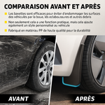 Proteggi efficacemente il tuo veicolo con questo set di 4 parafanghi universali per auto , progettati per limitare gli spruzzi di fango, ghiaia, acqua e sporco sulla carrozzeria. Facili da installare, questi parafanghi anteriori e posteriori si adattano alla maggior parte dei modelli di auto grazie al loro design flessibile e regolabile .